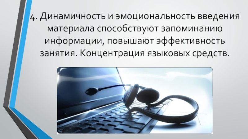 4. Динамичность и эмоциональность введения материала способствуют запоминанию информации, повышают эффективность занятия. Концентрация языковых средств.