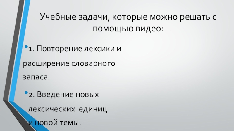 Учебные задачи, которые можно решать с помощью видео:1. Повторение лексики и расширение словарного запаса. 2. Введение новых