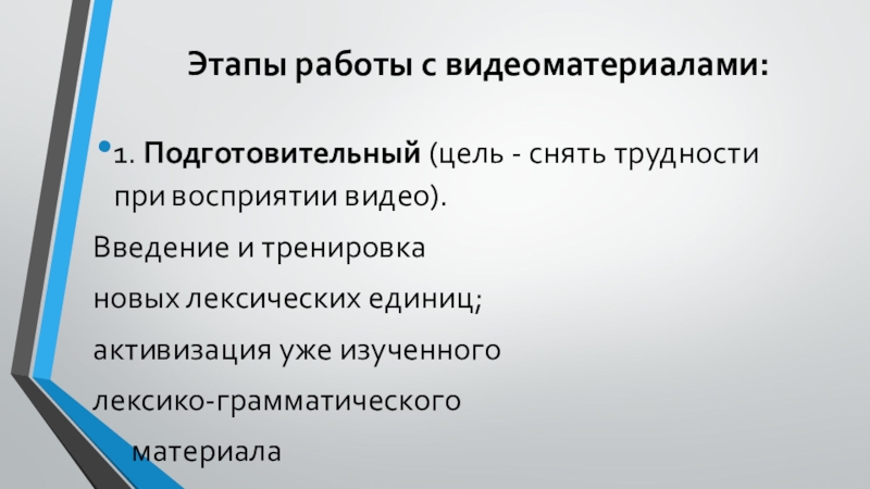Этапы работы с видеоматериалами: 1. Подготовительный (цель - снять трудности при восприятии видео).Введение и тренировка новых лексических