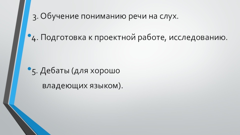 3. Обучение пониманию речи на слух. 4. Подготовка к проектной работе, исследованию. 5. Дебаты (для хорошо