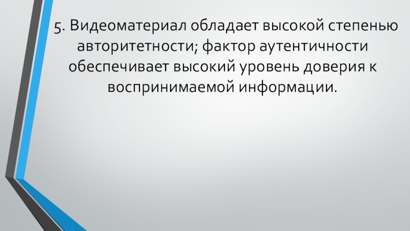 Слайд 6 5. Видеоматериал обладает высокой степенью авторитетности; фактор аутентичности обеспечивает высокий
