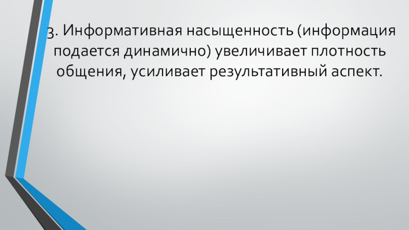3. Информативная насыщенность (информация подается динамично) увеличивает плотность общения, усиливает результативный аспект.