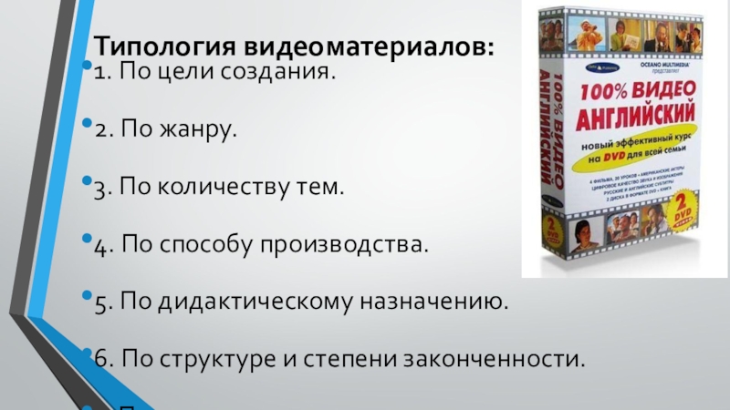 Типология видеоматериалов: 1. По цели создания.2. По жанру.3. По количеству тем. 4. По способу производства.