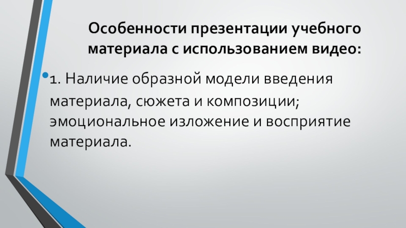 Особенности презентации учебного материала с использованием видео:1. Наличие образной модели введения материала, сюжета и композиции; эмоциональное изложение