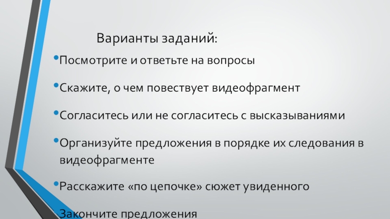 Варианты заданий: Посмотрите и ответьте на вопросыСкажите, о чем повествует видеофрагментСогласитесь или не согласитесь с высказываниямиОрганизуйте предложения