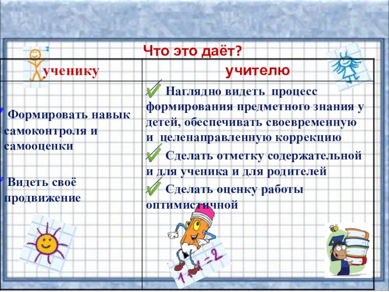Возможность включить механизмы самооценки ученика, что повышает степень осознанности процессов, связанных с обучением и выбором профильного направления.