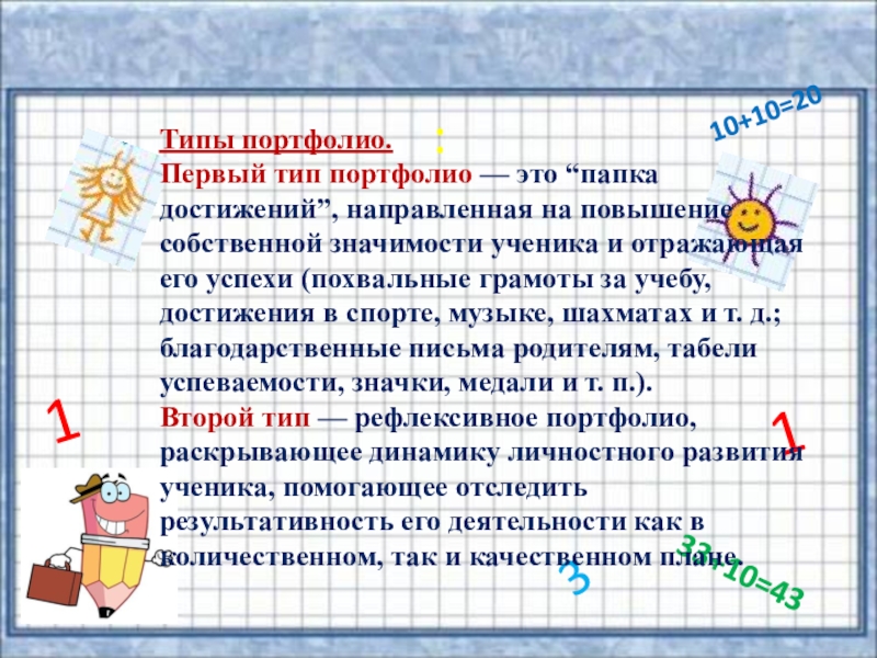 Второй тип — рефлексивное портфолио, раскрывающее динамику личностного развития ученика, помогающее отследить результативность его деятельности как в количественном, так и качественном плане.