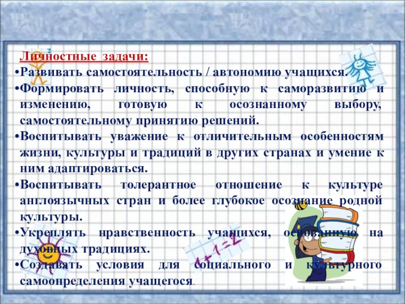 формировать личность обучающегося, что является принципиальным условием его/её самоопределения в той или иной социокульурной ситуации;