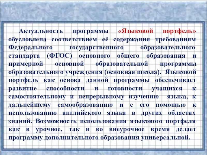 Слайд 3Актуальность программы «Языковой портфель» обусловлена соответствием её содержания требованиям Федерального государственного