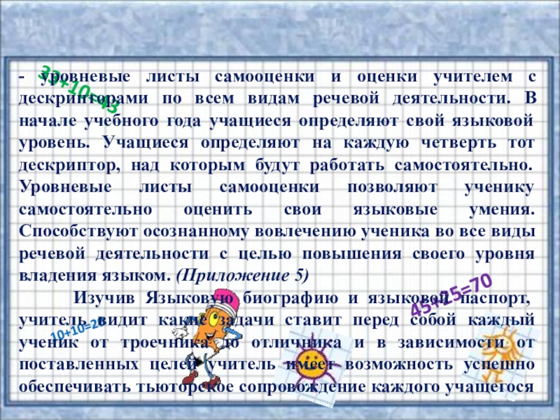 видам речевой деятельности. В начале учебного года учащиеся определяют свой языковой уровень. Учащиеся определяют на каждую четверть тот дескриптор, над которым будут работать самостоятельно. Уровневые листы самооценки позволяют ученику самостоятельно оценить свои языковые умения. Способствуют осознанному вовлечению ученика во все виды речевой деятельности с целью повышения своего уровня владения языком. (Приложение 5)