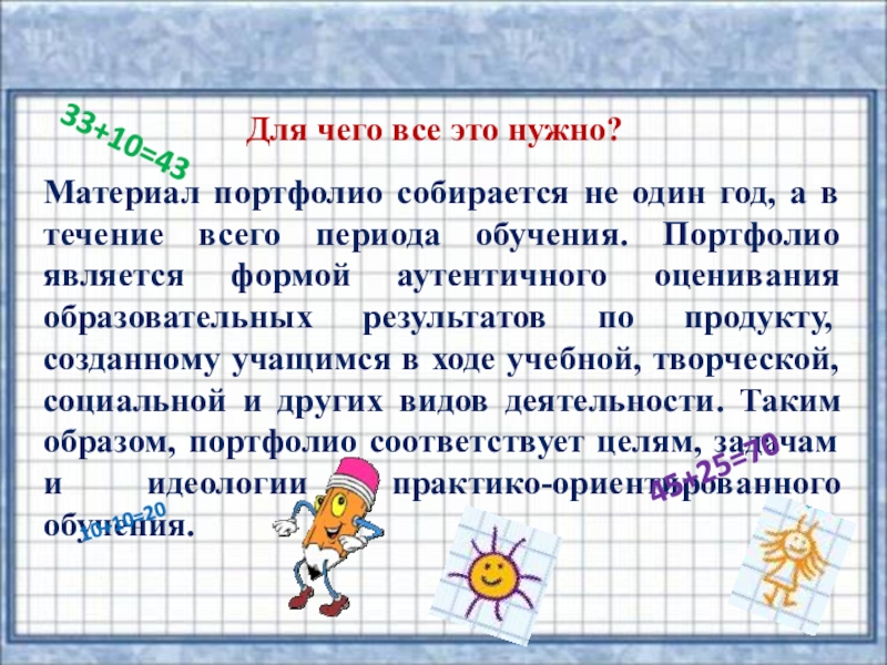 в течение всего периода обучения. Портфолио является формой аутентичного оценивания образовательных результатов по продукту, созданному учащимся в ходе учебной, творческой, социальной и других видов деятельности. Таким образом, портфолио соответствует целям, задачам и идеологии практико-ориентированного обучения.