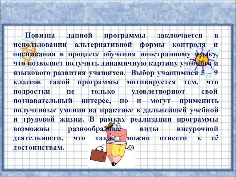 Слайд 4Новизна данной программы заключается в использовании альтернативной формы контроля и оценивания