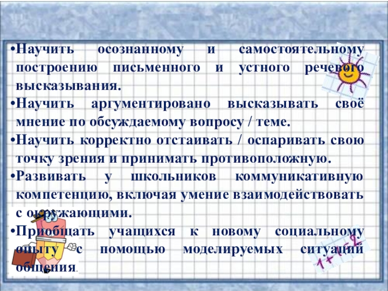 Слайд 10Научить осознанному и самостоятельному построению письменного и устного речевого высказывания.