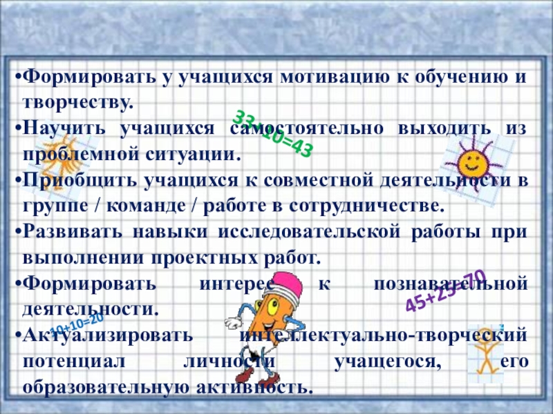 Формировать у учащихся мотивацию к обучению и творчеству.