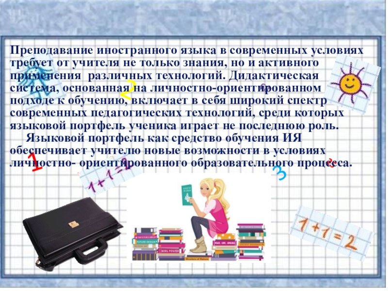 знания, но и активного применения различных технологий. Дидактическая система, основанная на личностно-ориентированном подходе к обучению, включает в себя широкий спектр современных педагогических технологий, среди которых языковой портфель ученика играет не последнюю роль.