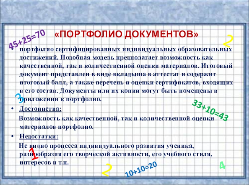 так и количественной оценки материалов. Итоговый документ представлен в виде вкладыша в аттестат и содержит итоговый балл, а также перечень и оценки сертификатов, входящих в его состав. Документы или их копии могут быть помещены в приложении к портфолио.