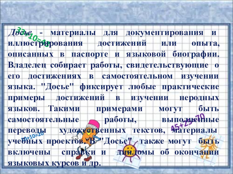 в паспорте и языковой биографии. Владелец собирает работы, свидетельствующие о его достижениях в самостоятельном изучении языка. "Досье" фиксирует любые практические примеры достижений в изучении неродных языков. Такими примерами могут быть самостоятельные работы, выполненные переводы художественных текстов, материалы учебных проектов. В "Досье" также могут быть включены справки и дипломы об окончании языковых курсов и др.