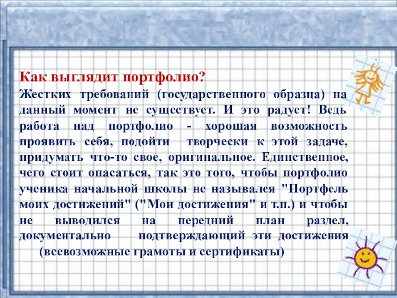 И это радует! Ведь работа над портфолио - хорошая возможность проявить себя, подойти творчески к этой задаче, придумать что-то свое, оригинальное. Единственное, чего стоит опасаться, так это того, чтобы портфолио ученика начальной школы не назывался "Портфель моих достижений" ("Мои достижения" и т.п.) и чтобы не выводился на передний план раздел, документально подтверждающий эти достижения (всевозможные грамоты и сертификаты)