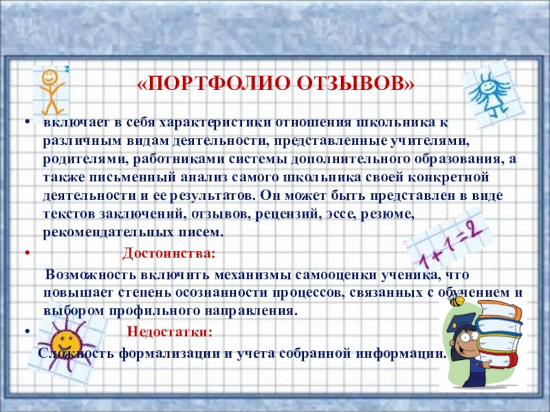 деятельности, представленные учителями, родителями, работниками системы дополнительного образования, а также письменный анализ самого школьника своей конкретной деятельности и ее результатов. Он может быть представлен в виде текстов заключений, отзывов, рецензий, эссе, резюме, рекомендательных писем.
