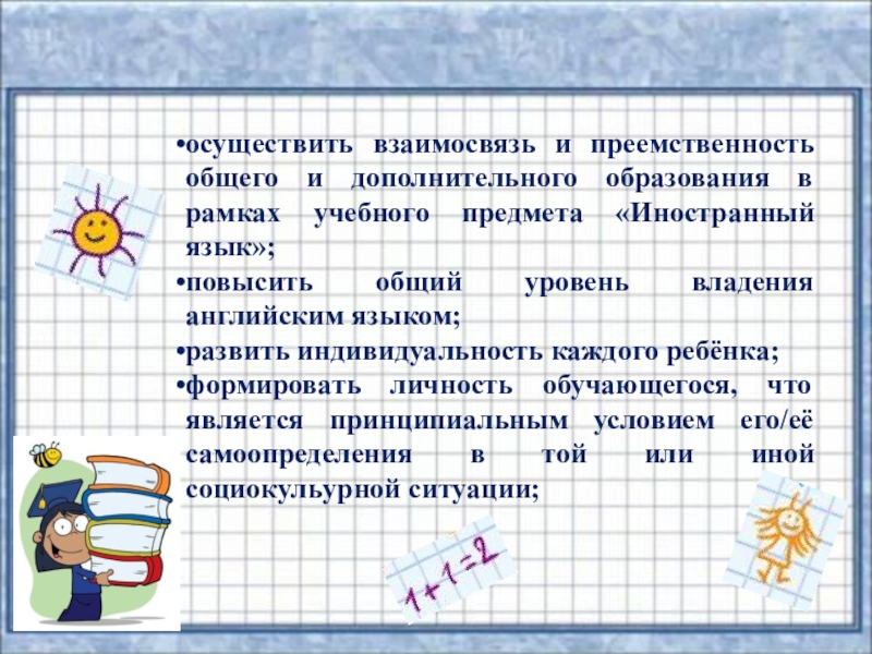 Слайд 6осуществить взаимосвязь и преемственность общего и дополнительного образования в рамках учебного