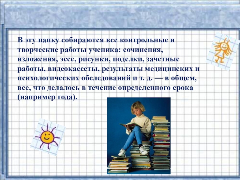 изложения, эссе, рисунки, поделки, зачетные работы, видеокассеты, результаты медицинских и психологических обследований и т. д. — в общем, все, что делалось в течение определенного срока (например года).