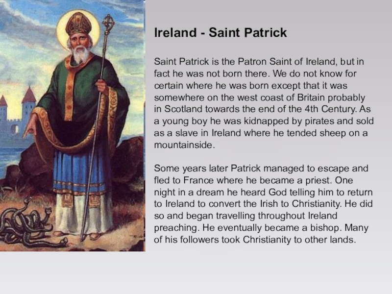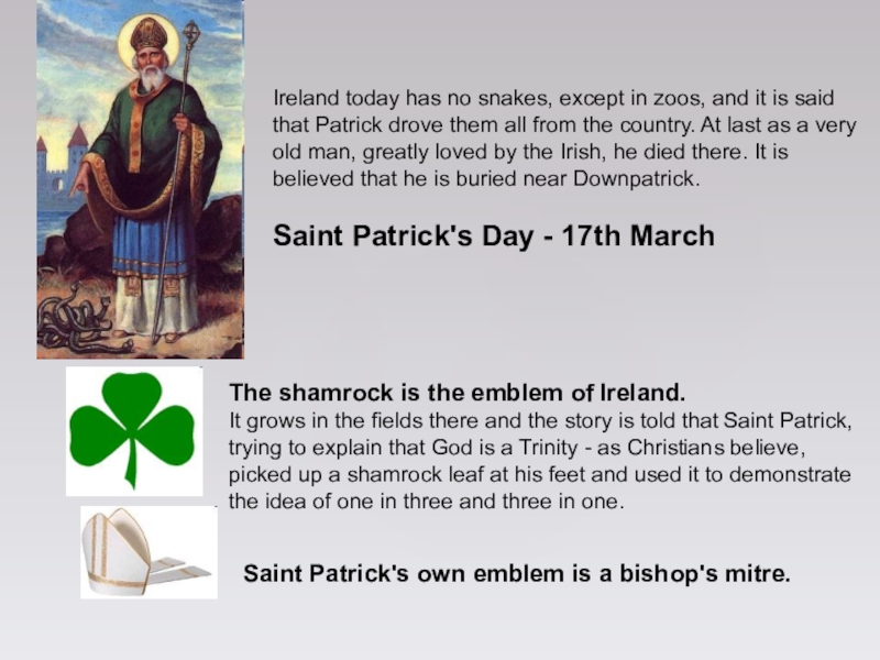 It grows in the fields there and the story is told that Saint Patrick, trying to explain that God is a Trinity - as Christians believe, picked up a shamrock leaf at his feet and used it to demonstrate the idea of one in three and three in one.