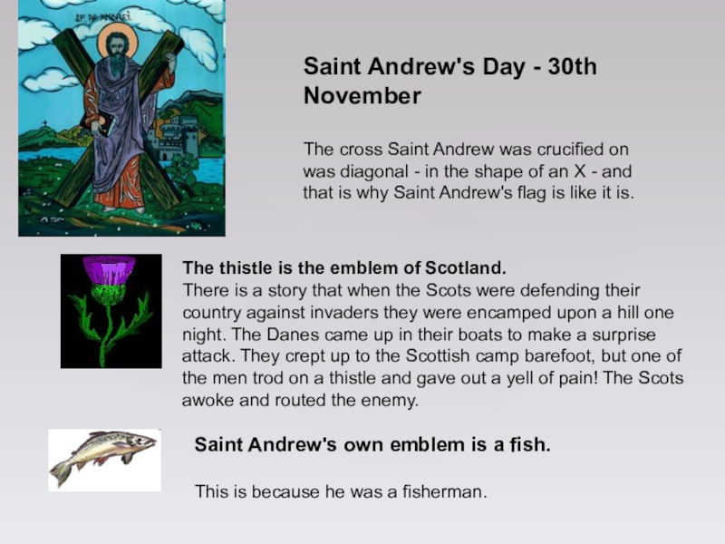 There is a story that when the Scots were defending their country against invaders they were encamped upon a hill one night. The Danes came up in their boats to make a surprise attack. They crept up to the Scottish camp barefoot, but one of the men trod on a thistle and gave out a yell of pain! The Scots awoke and routed the enemy.