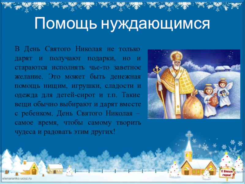 но и стараются исполнять чье-то заветное желание. Это может быть денежная помощь нищим, игрушки, сладости и одежда для детей-сирот и т.п. Такие вещи обычно выбирают и дарят вместе с ребенком. День Святого Николая – самое время, чтобы самому творить чудеса и радовать этим других!