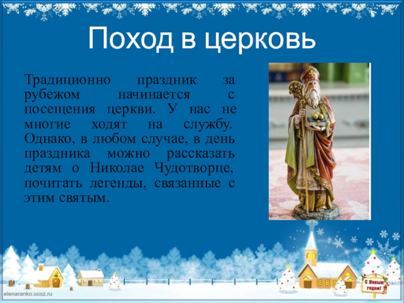 нас не многие ходят на службу. Однако, в любом случае, в день праздника можно рассказать детям о Николае Чудотворце, почитать легенды, связанные с этим святым.