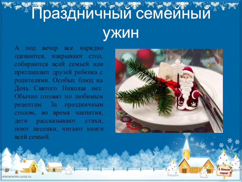 всей семьей или приглашают друзей ребенка с родителями. Особых блюд на День Святого Николая нет. Обычно готовят по любимым рецептам. За праздничным столом, во время чаепития, дети рассказывают стихи, поют песенки, читают книги всей семьей.