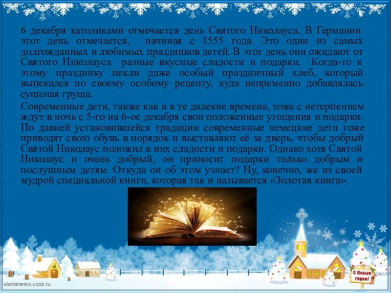 Современные дети, также как и в те далекие времена, тоже с нетерпением ждут в ночь с 5-го на 6-ое декабря свои положенные угощения и подарки. По давней установившейся традиции современные немецкие дети тоже приводят свою обувь в порядок и выставляют её за дверь, чтобы добрый Святой Николаус положил в них сладости и подарки. Однако хотя Святой Николаус и очень добрый, он приносит подарки только добрым и послушным детям. Откуда он об этом узнает? Ну, конечно, же из своей мудрой специальной книги, которая так и называется «Золотая книга».