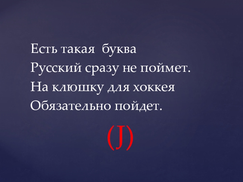Есть такая букваРусский сразу не поймет.На клюшку для хоккеяОбязательно пойдет. (J)
