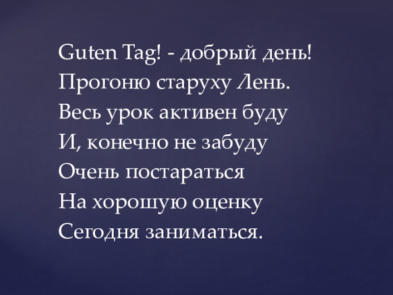 Guten Tag! - добрый день!Прогоню старуху Лень.Весь урок активен будуИ, конечно не забудуОчень постаратьсяНа хорошую оценкуСегодня заниматься.