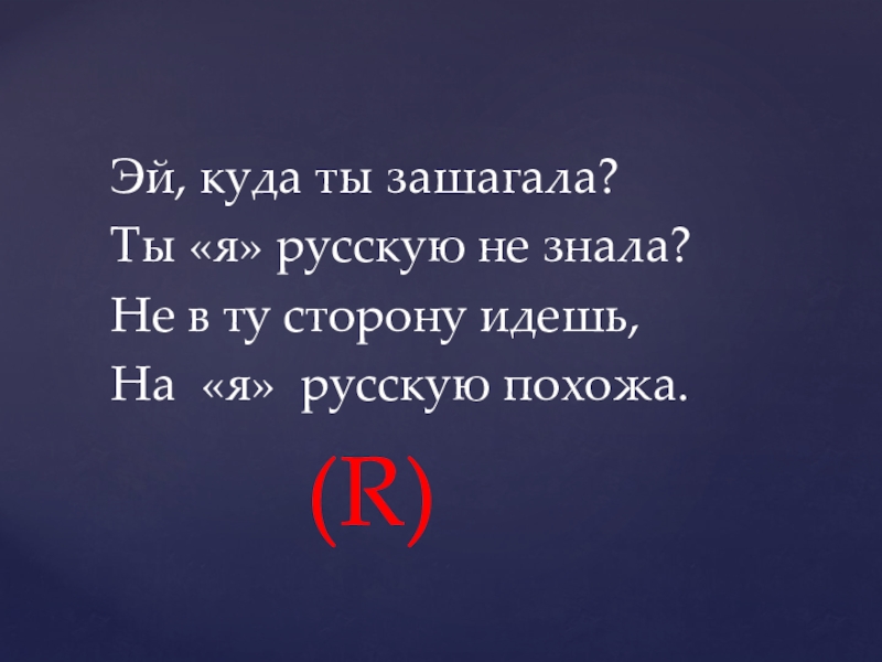 Эй, куда ты зашагала?Ты «я» русскую не знала?Не в ту сторону идешь,На «я» русскую похожа.