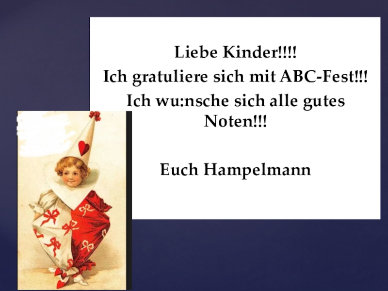 Liebe Kinder!!!!Ich gratuliere sich mit ABC-Fest!!!Ich wu:nsche sich alle gutes Noten!!!Euch Hampelmann