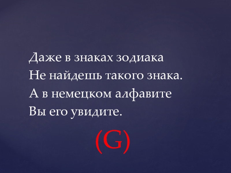 Даже в знаках зодиакаНе найдешь такого знака.А в немецком алфавитеВы его увидите. (G)