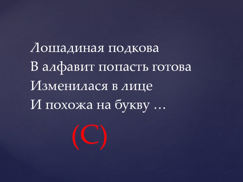 Лошадиная подковаВ алфавит попасть готоваИзменилася в лицеИ похожа на букву …