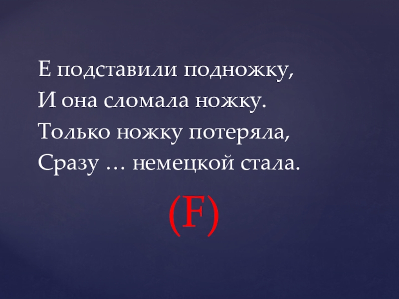 Е подставили подножку,И она сломала ножку.Только ножку потеряла,Сразу … немецкой стала. (F)