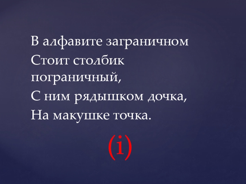 В алфавите заграничном Стоит столбик пограничный,С ним рядышком дочка,На макушке точка. (i)