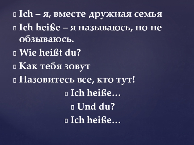 Ich – я, вместе дружная семьяIch heiße – я называюсь, но не обзываюсь.Wie heißt du? Как тебя