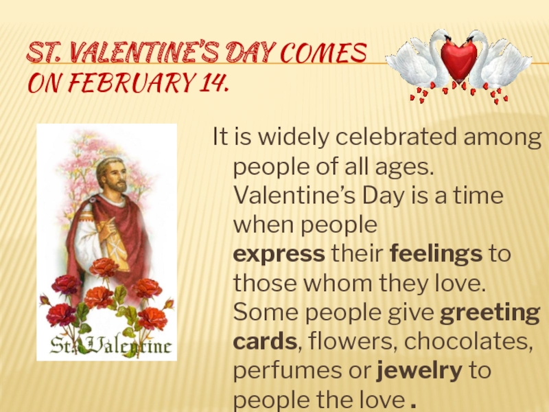 St. Valentine’s Day comes on February 14.It is widely celebrated among people of all ages. Valentine’s Day is a time when people express their feelings to those whom they love. Some people give greeting cards, flowers, chocolates, perfumes or jewelry to people