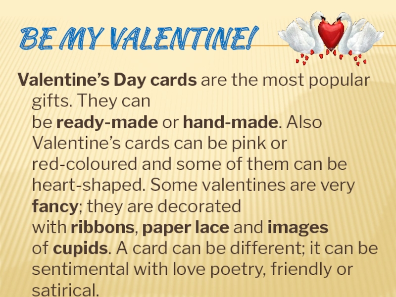 be ready-made or hand-made. Also Valentine’s cards can be pink or red-coloured and some of them can be heart-shaped. Some valentines are very fancy; they are decorated with ribbons, paper lace and images of cupids. A card can be different; it can be sentimental with love poetry, friendly or satirical.