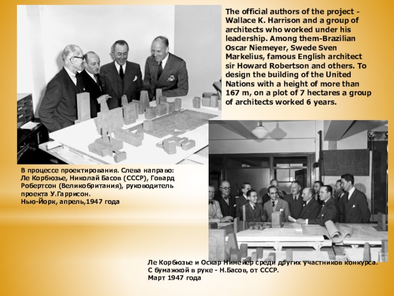 Ле Корбюзье, Николай Басов (СССР), Говард Робертсон (Великобритания), руководитель проекта У.Гаррисон.