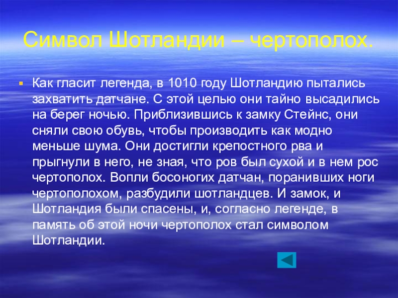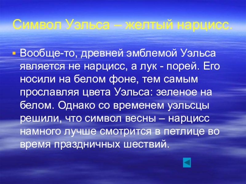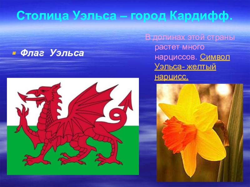 Уэльс маленькая горная страна, известная народным фольклором. Ежегодно в Уэльсе проводится фестиваль валлийских бардов – айстедвод.