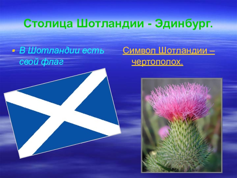 Шотландия расположена к северу от Англии. Это страна озер и гор.