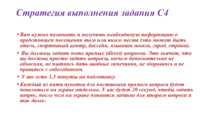 Вы должны задать пять прямых (direct) вопросов. Это значит, что вы должны просто задать вопросы, ничего дополнительно не объясняя, не пытаясь дать вводные замечания, не здороваясь и не прощаясь с собеседником.