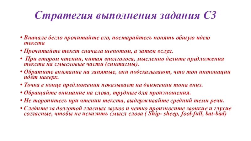 Следите за долготой гласных звуков и четко произносите звонкие и глухие согласные, чтобы не исказить смысл слова ( Ship- sheep, fool-full, bat-bad)