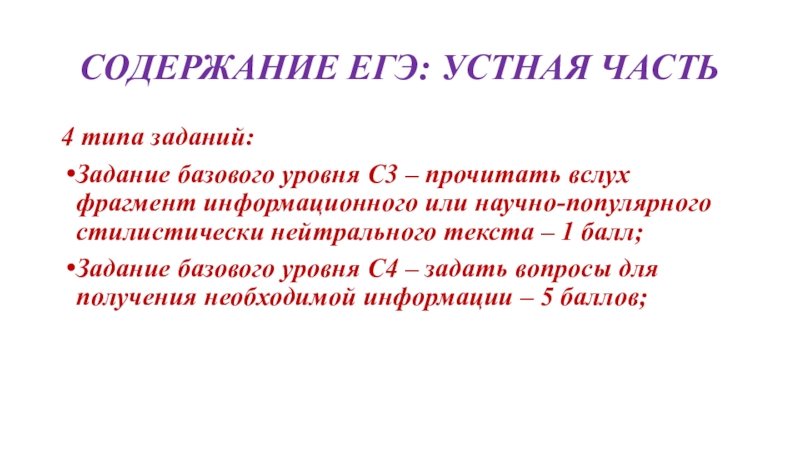 Слайд 4СОДЕРЖАНИЕ ЕГЭ: УСТНАЯ ЧАСТЬ