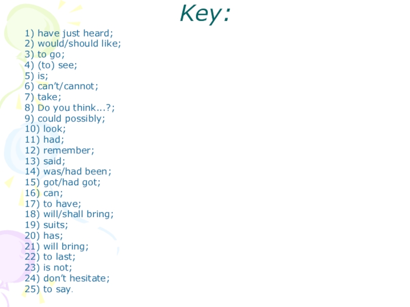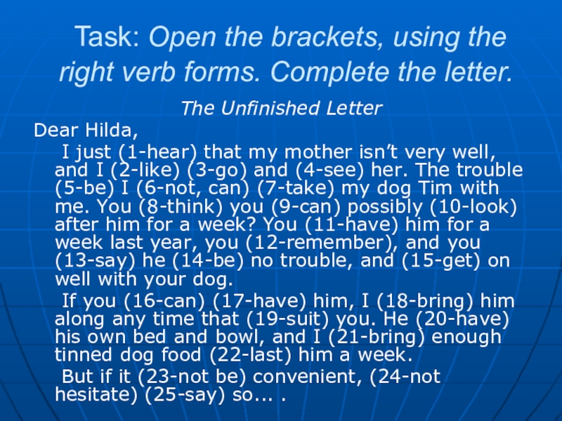 I just (1-hear) that my mother isn’t very well, and I (2-like) (3-go) and (4-see) her. The trouble (5-be) I (6-not, can) (7-take) my dog Tim with me. You (8-think) you (9-can) possibly (10-look) after him for a week? You (11-have) him for a week last year, you (12-remember), and you (13-say) he (14-be) no trouble, and (15-get) on well with your dog.