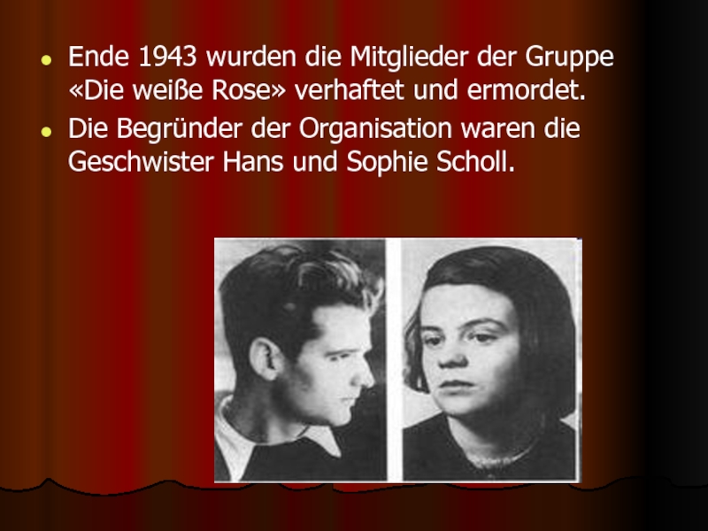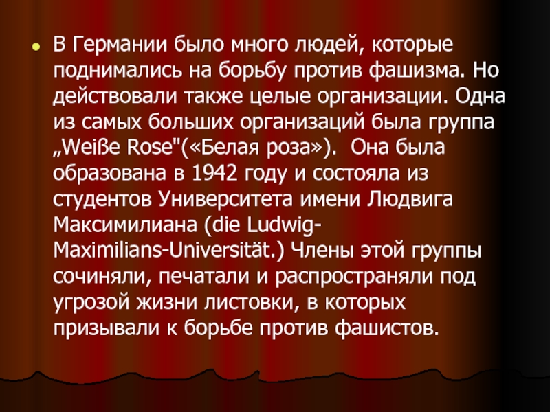 Но действовали также целые организации. Одна из самых больших организаций была группа „Weiße Rose"(«Белая роза»). Она была образована в 1942 году и состояла из студентов Университета имени Людвига Максимилиана (die Ludwig- Maximilians-Universität.) Члены этой группы сочиняли, печатали и распространяли под угрозой жизни листовки, в которых призывали к борьбе против фашистов.